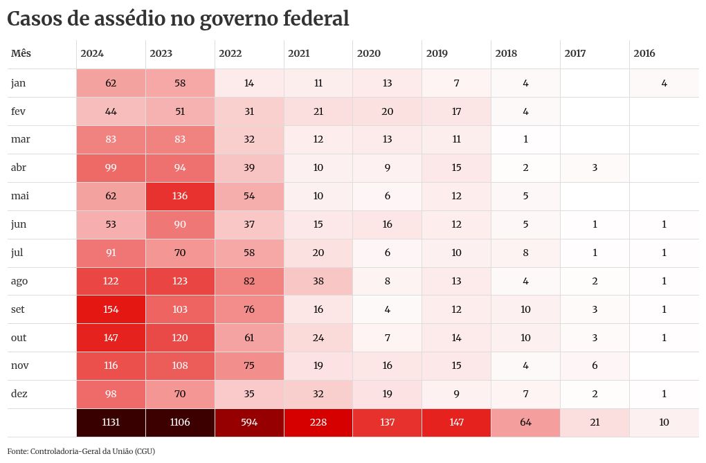 A Controladoria-Geral da União (CGU) contabilizou 1.131 denúncias de assédio sexual ao longo de 2024 dentro da esfera do governo federal. O número representa uma alta em relação aos anos anteriores. Em 2023, por exemplo, foram registrados 1.106 casos.