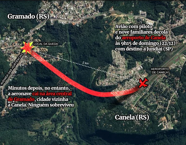 A aeronave havia decolado de Canela com destino a Jundiaí, mas caiu poucos minutos após a decolagem, em meio a condições climáticas adversas, com chuva e neblina.