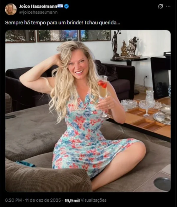 “Sempre há tempo para um brinde! Tchau querida…”, escreveu Joice, publicando uma foto em que aparece segurando uma taça de champanhe.