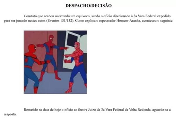 - Após o uso de um conhecido meme do Homem-Aranha em um despacho judicial, juízes receberam uma recomendação sobre o uso prudente de expressões informais em decisões judiciais;