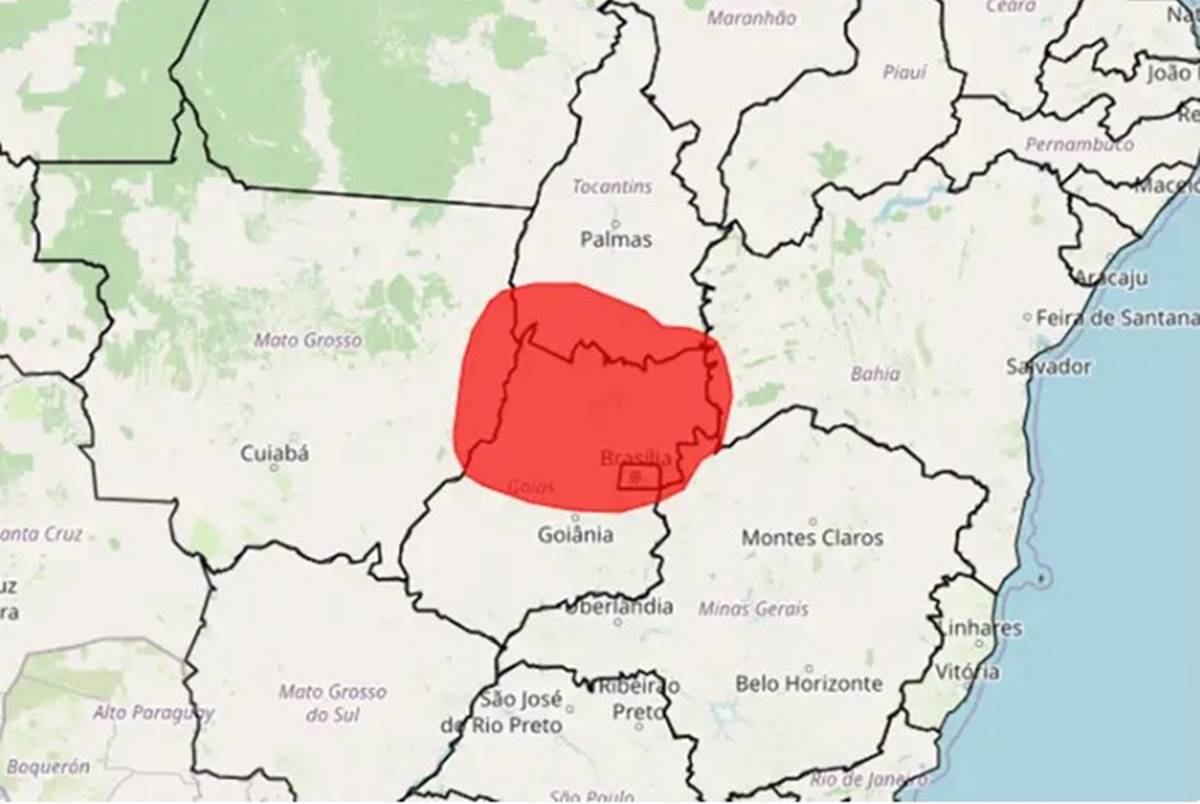 O alerta entrou em vigor às 13h de hoje e se encerra às 18h. O aviso cobre todo o Distrito Federal, além o leste, centro, norte e noroeste de Goiás. Estão sob alerta ainda o extremo oeste da Bahia, o noroeste de Minas, as regiões oriental e ocidental do Tocantins, além do nordeste mato-grossense. Confira no mapa abaixo.