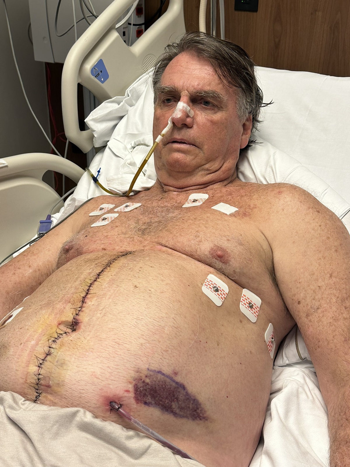 O procedimento foi feito para remover aderências intestinais e reconstruir a parede abdominal, complicações que, de acordo com os médicos, são decorrentes da facada sofrida pelo ex-presidente em 2018, durante a campanha eleitoral. Neste domingo, Bolsonaro postou em suas redes sociais uma foto do tórax sem curativo, deixando expostos os pontos da operação. Veja: