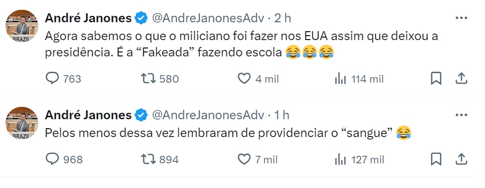 “Actualmente sabemos o que o miliciano foi elaborar nos EUA mal deixou a presidência. É a “Fakeada” fazendo colégio”, escreveu. Então depois, acrescentou: “Pelos menos dessa turno lembraram de providenciar o ‘sangue’.”