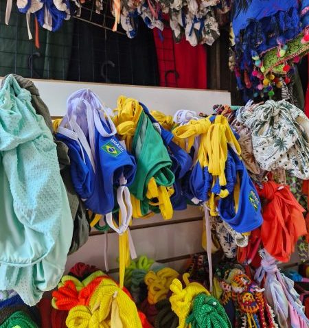 “Como aqui é um mercado popular, vem muito gringo. E eles querem comprar muitas coisas do Brasil – biquíni, bandeira, blusa. Todos os dias a procura é grande. E esse biquíni que tá em alta, com aquela marquinha de fita, ficou famoso e tem muita saída”, contou a comerciante Jaqueline da Silva.