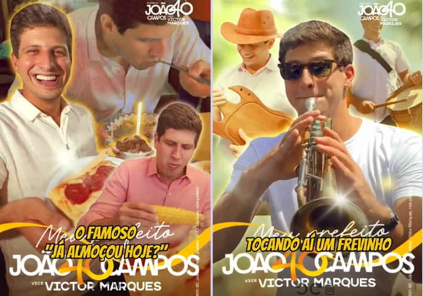 Os “santinhos colecionáveis” têm diversos modelos. Um deles é o “nevou”, que conta com fotos do prefeito com o cabelo descolorido. João Campos também aparece na versão musical, com um santinho com fotos dele tocando trompete e tambor.