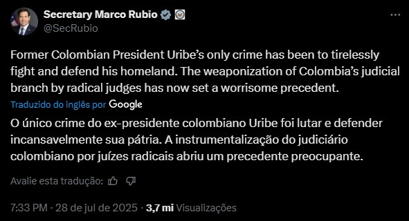 Post de Marco Rubio sobre Álvaro Uribe | Foto: Reprodução/X