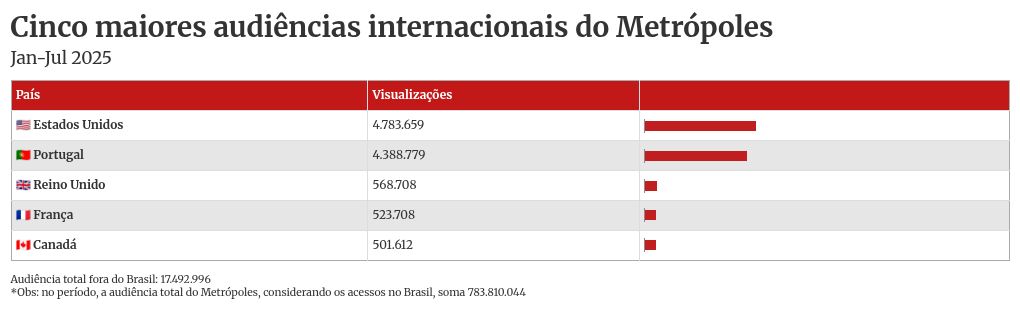 Depois do Brasil, a maior audiência internacional do Metrópoles é nos Estados Unidos, com 4,7 milhões de visualizações no primeiro semestre de 2025. Em seguida, aparece Portugal, onde houve 4,3 milhões de acessos durante o período. Ao todo, o portal contabiliza mais de 17,4 milhões de views oriundos do exterior neste ano.