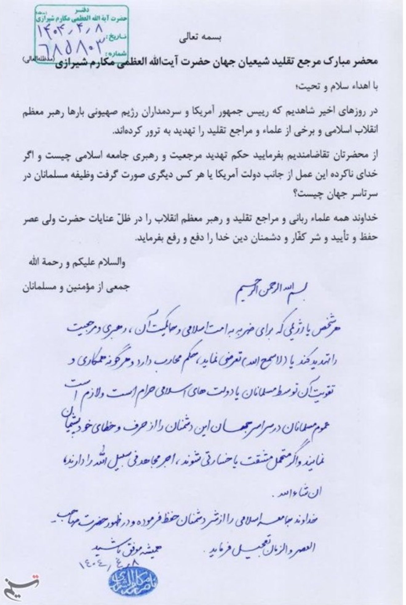 “Aqueles que ameaçam a liderança e a integridade da ummah islâmica devem ser considerados senhores da guerra”, afirmou Makarem. Ele terminou o decreto com uma oração pedindo proteção contra esses “inimigos” e pela rápida vinda do Mahdi, figura messiânica do islamismo xiita.