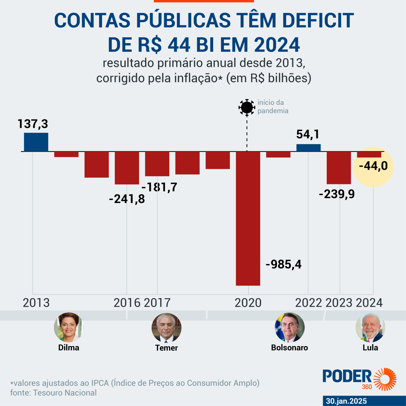 Leia a trajetória das contas do governo de 2013 a 2024, em valores corrigidos pela inflação: