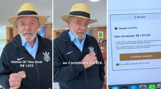 “Hoje eu coloquei a camisa do Corinthians porque eu vou fazer uma doação ao Corinthians via Pix”, disse o presidente. “Vou doar R$ 1.013 para ajudar o Corinthians a resolver o problema da sua dívida. Eu estou junto com a torcida do Corinthians porque eu acredito no Pix, acredito no governo”, prosseguiu.
