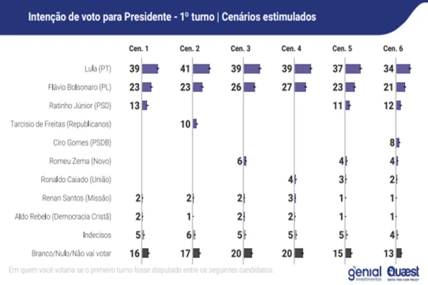 Esta é a primeira pesquisa do instituto sem a presença do ex-presidente Jair Bolsonaro (PL) nos cenários testados. A decisão da Quaest de tirar Bolsonaro das pesquisas se deu pela escolha do ex-presidente em indicar o filho Flávio como candidato.