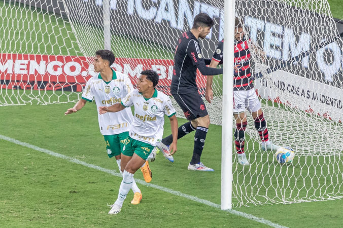MAGA JR/AGÊNCIA F8/ESTADÃO CONTEÚDOLuighi (c), do Palmeiras, comemora seu gol marcado com o Flamengo em partida válida pela 22ª rodada do Campeonato Brasileiro