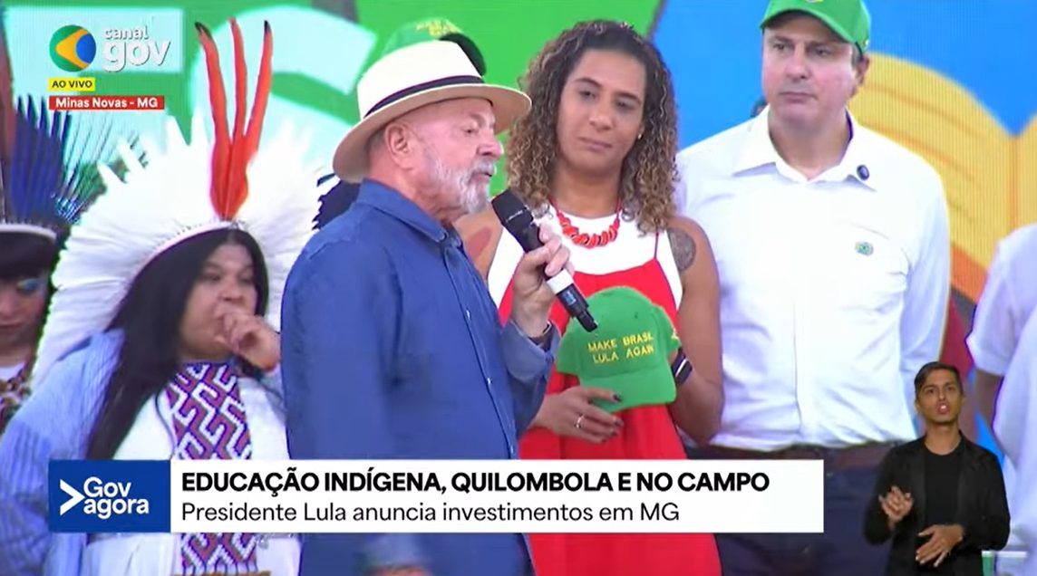 Um boné com a frase “Make Brasil Lula Again” estampada chamou atenção durante a cerimônia. A peça, inspirada no slogan da campanha de Donald Trump nos Estados Unidos, foi exibida por ministros — incluindo a titular da Igualdade Racial, Anielle Franco.