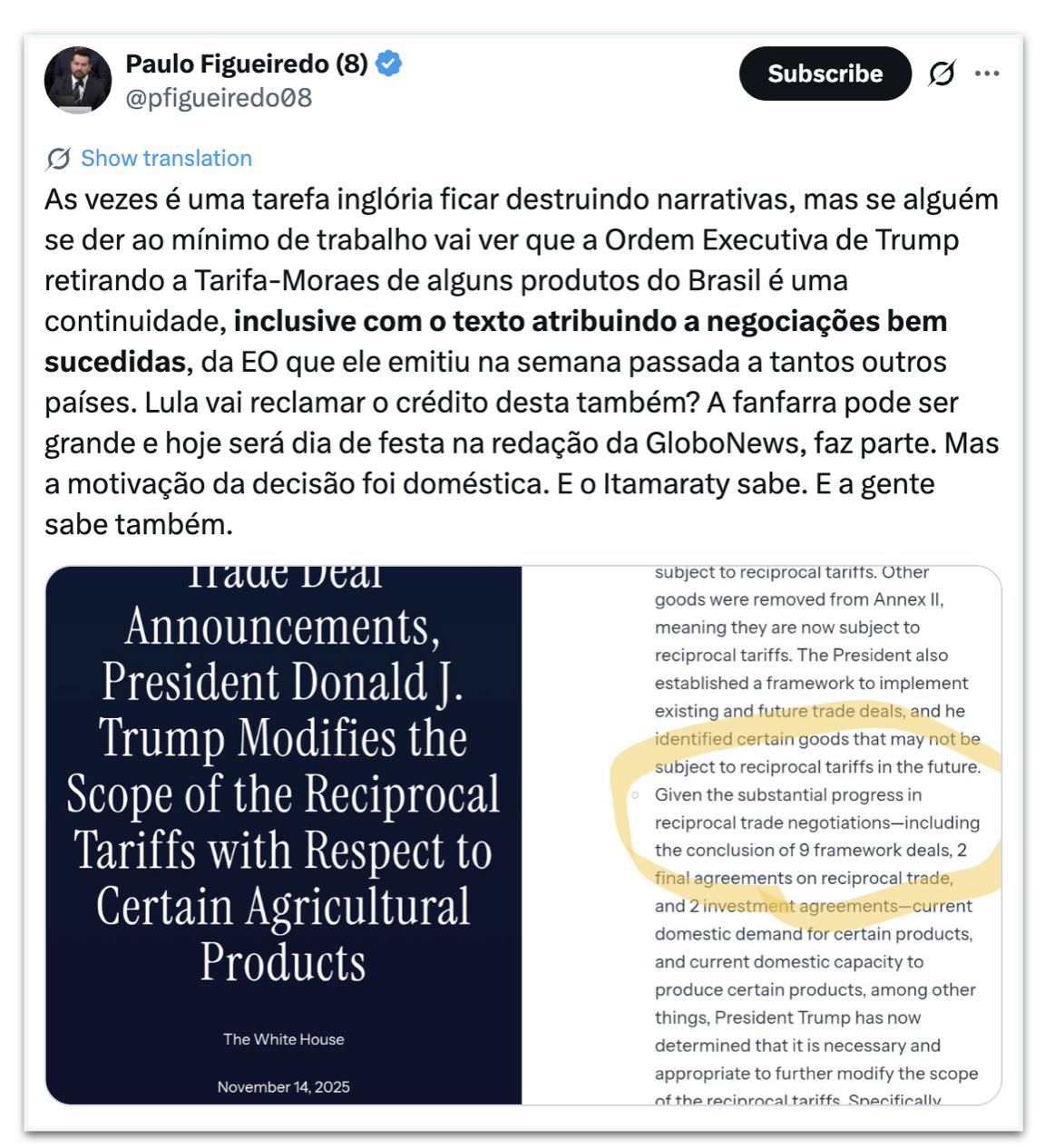 Em seu perfil no X, Figueiredo afirmou que a recente Ordem Executiva de Trump dá continuidade a um decreto anterior. Em 14 de novembro, os EUA já haviam retirado uma tarifa de 10% sobre itens semelhantes. A decisão anterior era para todos os países, diferentemente da atual, que é direcionada só ao Brasil.