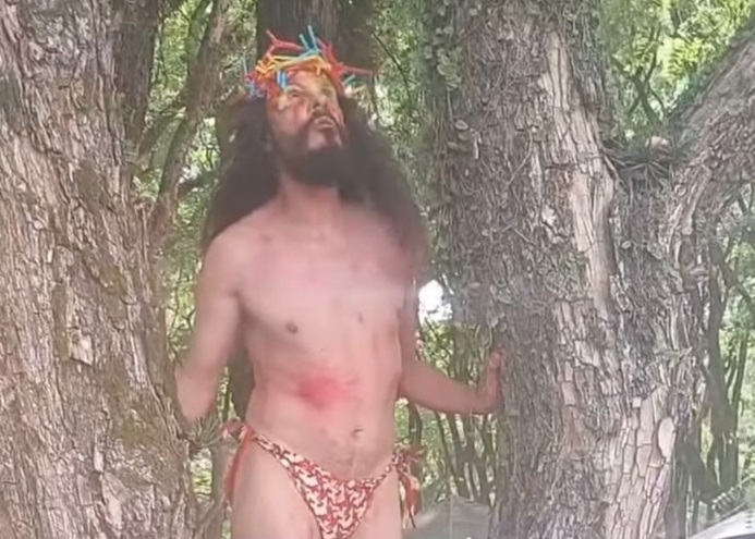 Em um vídeo nas redes sociais, é possível ver o homem de cabelo longo, uma coroa de flores e roupa social. Enquanto canta, ele começa a tirar toda a roupa, até ficar de fio-dental. O caso foi visto por críticos como um ataque ao cristianismo e aos valores religiosos da maioria da população brasileira.