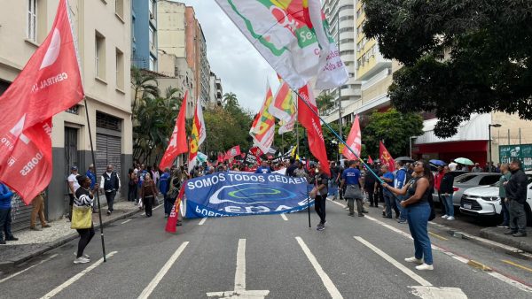 Manifestantes caminham, nesta quinta-feira (9), do Largo do Machado até o Palácio Guanabara, em protesto contra a abertura de capital da Cedae. O ato conta com a participação de movimentos populares e sindicatos que representam os trabalhadores da companhia.