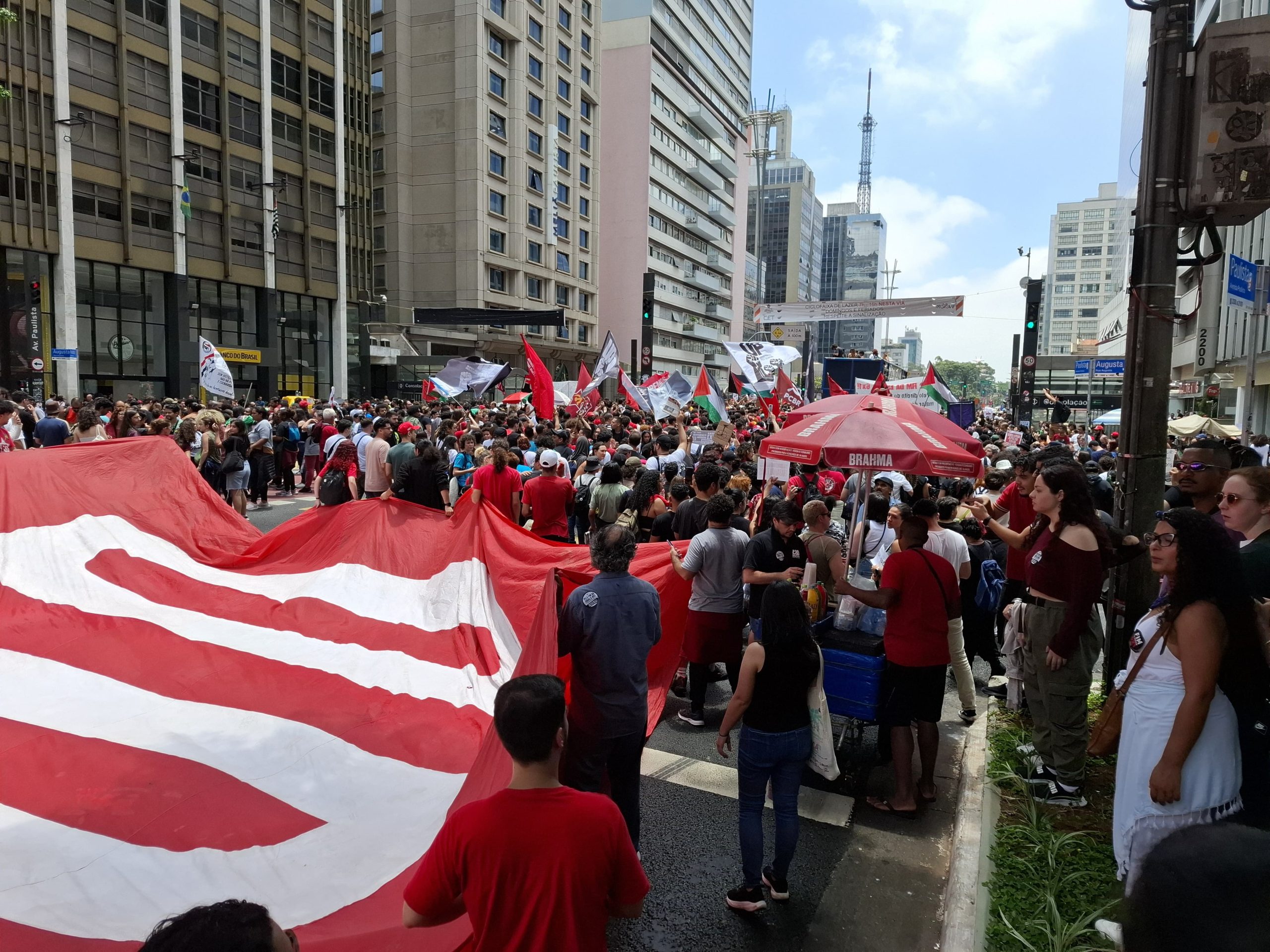 Pessoas com boné do MST também marcaram presença, assim como manifestantes com bandeiras e faixas da Palestina, que tem um de seus territórios, a Faixa de Gaza, controlada pelo grupo terrorista Hamas.