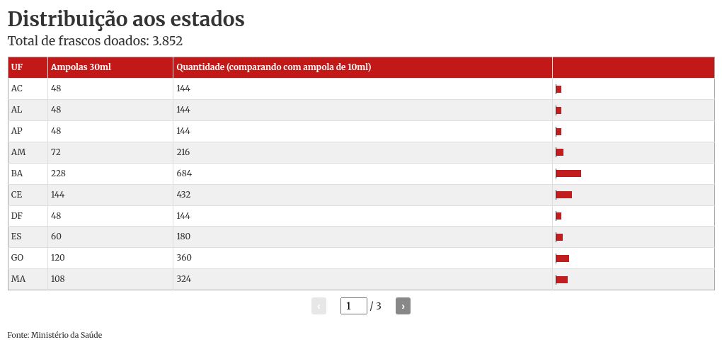 Segundo o ministério, a fabricação do antídoto normalmente utiliza ampolas de 10 ml, mas a empresa produziu e doou frascos de 30 ml. O volume total equivale a 11,556 ampolas padrão de etanol farmacêutico. Confira a distribuição por estado: