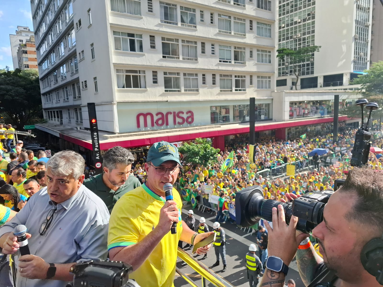 Bolsonaro chegou ao protesto no momento em que tocava o hino do Palmeiras — time do ex-presidente. No trio elétrico, o político se juntou a aliados políticos, como o organizador do evento, Silas Malafaia.