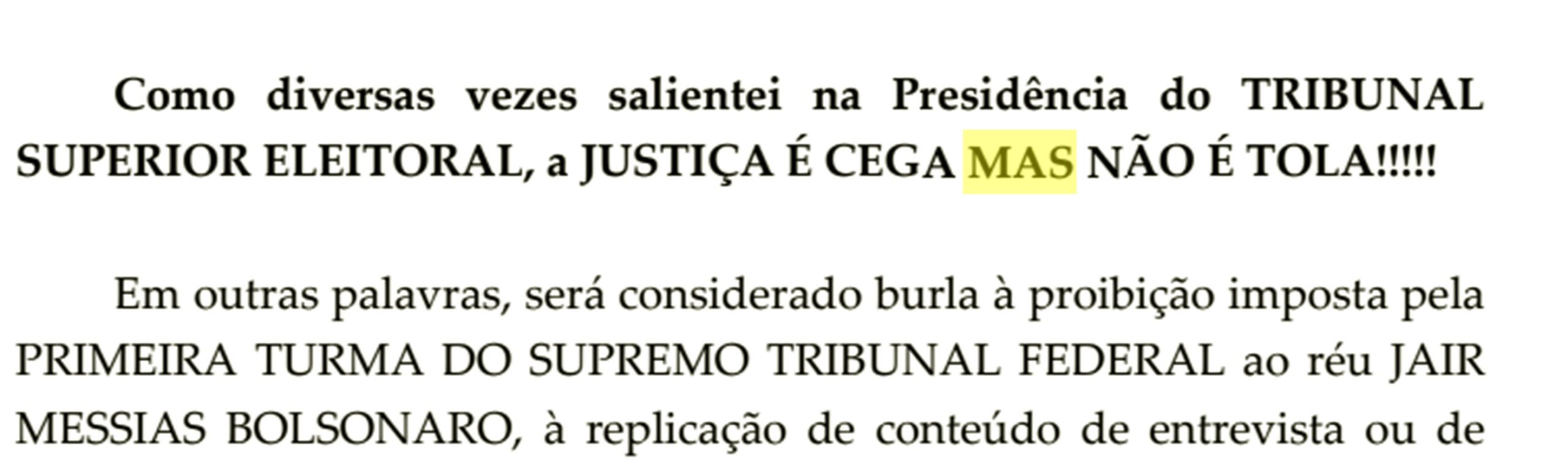 Ao tentar mandar um recado a Bolsonaro, o ministro do Supremo escreveu: “Como diversas vezes salientei na Presidência do TRIBUNAL SUPERIOR ELEITORAL (sic), a JUSTIÇA É CEGA MAIS NÃO É TOLA (sic)”.