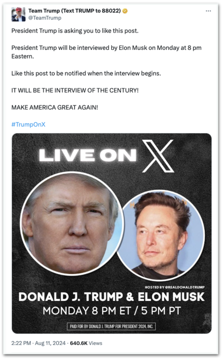 O perfil da campanha do republicano afirmou que “será a entrevista do século”. No domingo (11.ago), a página publicou: “Curta este post para ser avisado quando a entrevista começar. Será a entrevista do século! Faça a América grande de novo!”.