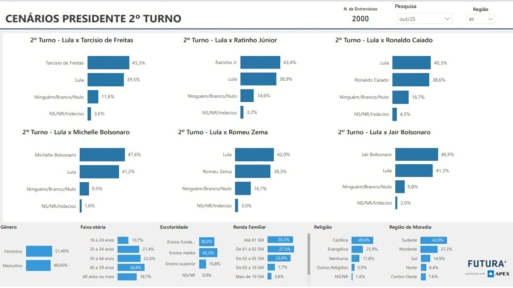 A Futura Inteligência testou diferentes cenários para o primeiro turno, destacando o crescimento de Ratinho Jr., Tarcísio de Freitas e Michelle Bolsonaro como alternativas viáveis ao atual presidente, especialmente entre apoiadores do campo conservador e do legado bolsonarista.