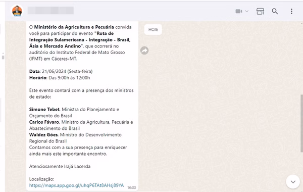 Número de celular de uma assessoria pessoal de Irajá Lacerda está convidando pessoas para um evento do Mapa, em Cáceres (MT), usando a assinatura do secretário, que foi candidato a deputado federal pelo PSD em 2022. Ele não conseguiu se eleger. A cidade com cerca de 95 mil habitantes foi sua base eleitoral.