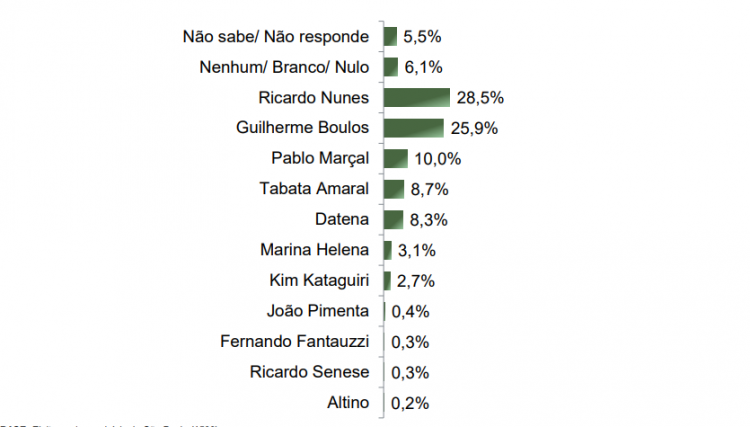 Nunes foi perfeito por 28,% dos entrevistados e Boulos por 25,9%, na indagação estimulada, em que os nomes dos pré-candidatos são apresentados