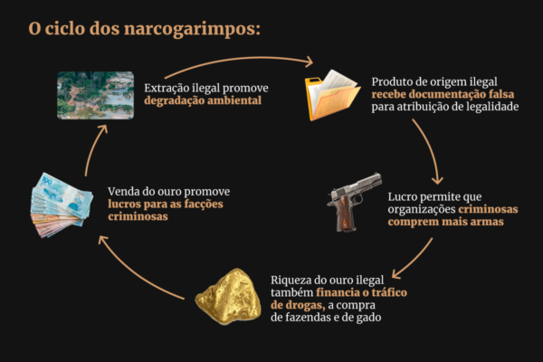 O crime organizado encontrou na cadeia ilegal do ouro uma importante fonte de renda. Estimativa do Fórum Brasileiro de Segurança Pública (FBSP) aponta que, por ano, o crime movimente ao menos R$ 18,2 bilhões. O montante equivale a 27 prêmios da Mega da Virada. Além do lucro do garimpo, o mineral serve à lavagem de dinheiro, financia o tráfico de drogas e a compra de armas.