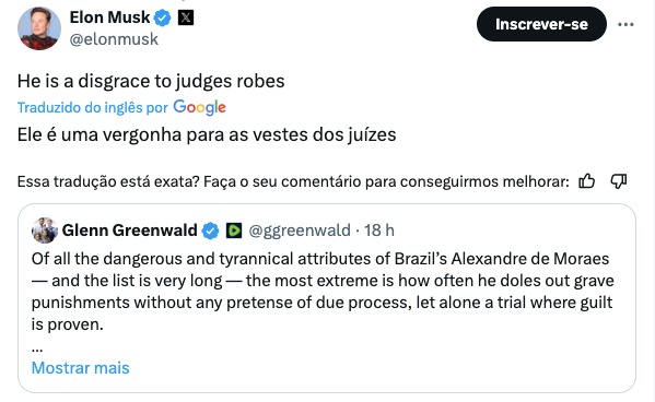 Por meio do seu perfil no Twitter/X, o empresário e dono da rede social, Elon Musk, afirmou que outras plataformas de mídia que operam no Brasil “cumprem as exigências ilegais” de Alexandre de Moraes. Na publicação, Musk chamou o magistrado de “Ditador Voldemort”, em referência ao vilão da saga Harry Potter.