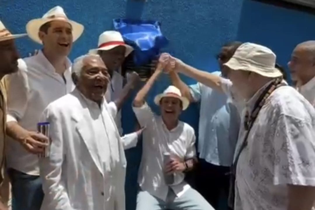 O prefeito Eduardo Paes (PSD) acompanhou a entrega, usando um chapéu panamá, ao lado de Mestre Moa e de frequentadores históricos do clube.