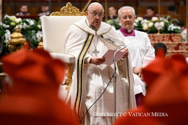 O papa se locomoveu de cadeira de rodas durante a cerimônia por sentir dores nos joelhos e nas costas. No entanto, não há nota oficial do Vaticano sobre o motivo das manchas roxas ao redor do queixo.