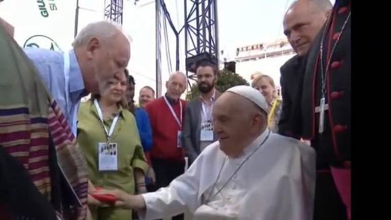 Na ocasião, Stédile pediu a bênção do pontífice para a bandeira do “movimento social”. Um vídeo divulgado nas redes sociais mostra o momento em que o papa coloca a mão sobre a bandeira vermelha.