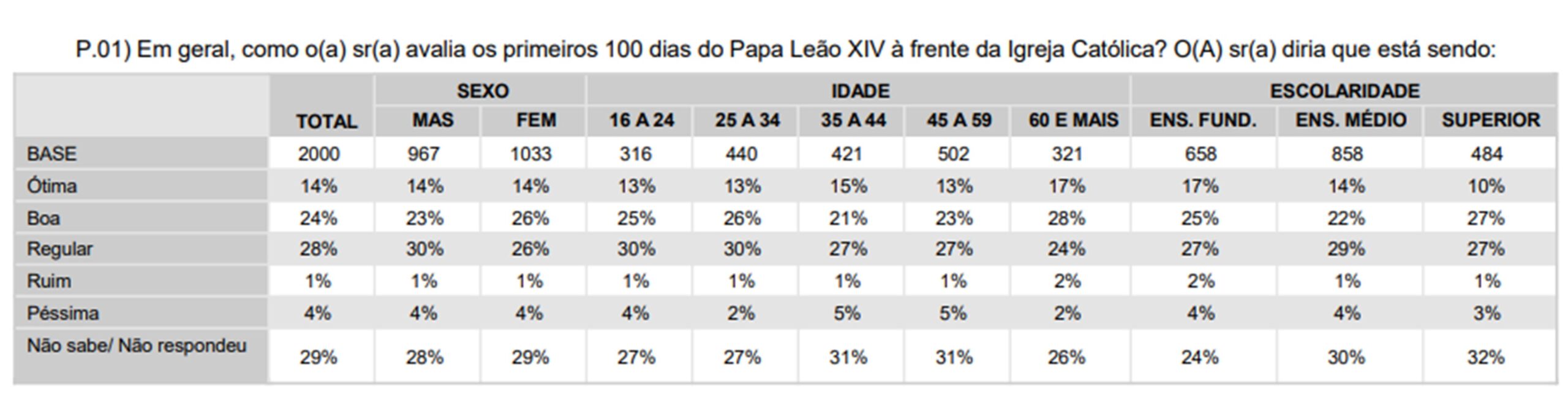 Chama a atenção ainda o alto percentual de entrevistados que ainda não formaram uma opinião: 29%. Nesse caso, eles afirmaram não saber ou preferiram não responder à pergunta, o que indica, para uma parcela significativa da população, Leão XIV ainda está em observação.