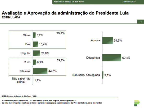 O Instituto Paraná Pesquisas divulgou nesta quinta-feira (10) um levantamento sobre o governo Lula no estado de São Paulo, onde aponta que 62,4% da população reprova a gestão do petista. Cerca de 53,3% dos entrevistados classificaram como ruim ou péssima e 23,6% nomearam como boa ou ótima. Para a realização desta pesquisa foi utilizada uma amostra de 1680 eleitores, em 84 municípios, com um grau de confiança de 95,0% para uma margem estimada de erro de aproximadamente 2,4 pontos percentuais para os resultados gerais.