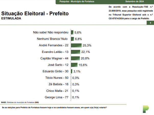 O Instituto Paraná Pesquisas divulgou nesta segunda-feira (23) sua pesquisa de intenções de voto para a prefeitura de Fortaleza. Em primeiro lugar no cenário estimulado, ou seja, onde os candidatos são apresentados ao eleitor, André Fernandes (PL) lidera com 25,3%. Em segundo lugar, Evandro Leitão (PT) alcançou 22,1%. Em terceiro e quarto lugar, respectivamente, temos Capitão Wagner (União Brasil) com 20,8% e José Sarto (PDT) com 15,6%. Técio Nunes (PSOL) e Zé Batista (PSTU) pontuam 0,3%, enquanto Chico Malta (PCB) e George Lima (Solidariedade) também alcançaram a mesma quantidade, de 0,1%.