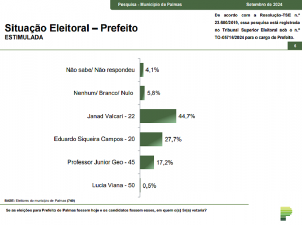 Para a realização desta pesquisa foi utilizada uma amostra de 740 eleitores. Tal amostra representativa do município de Palmas atinge um grau de confiança de 95,0% para uma margem estimada de erro de aproximadamente 3,7 pontos percentuais para os resultados gerais. De acordo com a Resolução-TSE n.º 23.600/2019, essa pesquisa está registrada no Tribunal Superior Eleitoral sob o n.º TO-05716/2024 para o cargo de Prefeito.