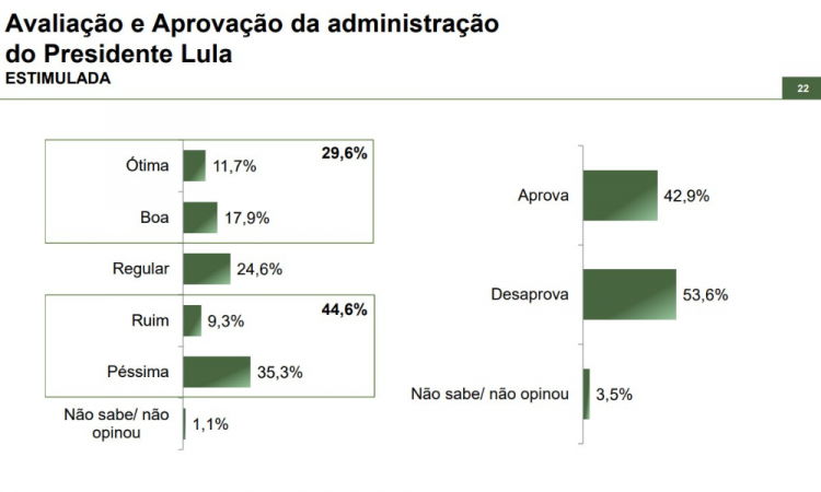 Uma pesquisa do Instituto Paraná Pesquisas divulgada nesta segunda-feira (25) mostra que o presidente Luiz Inácio Lula da Silva obteve a aprovação de 42,9% dos brasileiros, indicando um crescimento. Em junho, o índice era de 39,8%, enquanto em abril deste ano, a aprovação era de 39,2% dos eleitores. Por outro lado, a rejeição ao governo apresentou uma queda de 3,8 pontos percentuais e chegou a 53,6%.