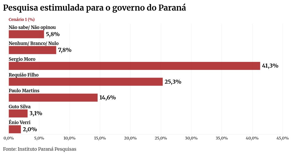 O resultado mais modesto de Moro foi no cenário 2, com 39%, mas mesmo assim abriu frente de 15,9 pontos percentuais sobre o segundo colocado, Requião Filho, que obteve 23,1% da preferência do eleitorado.