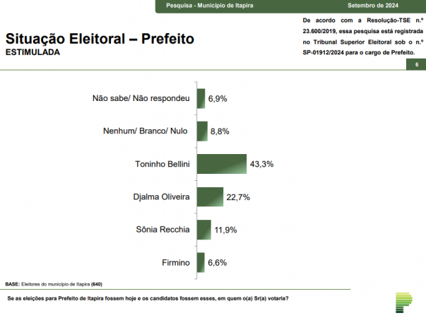 O Instituto Paraná Pesquisas divulgou nesta terça-feira (3) seu levantamento de intenções de voto para a prefeitura de Itapira. O candidato Toninho Bellini (PSD) figura na primeira posição, com 43,3% de intenções de voto. Em segundo lugar, Djalma Oliveira (PL) com 22,7% das citações por parte dos eleitores. Sônia Recchia (PT) pontua apenas 11,9%, ocupando a terceira posição do levantamento. Em quarto lugar, aparece Firmino alcançando 6,6%. Se considerados os níveis de rejeição, a primeira colocação é ocupada pela Sônia Recchia, com 37,7%. Djalma Oliveira ocupa a segunda posição do ranking com 22,8%. Já Toninho Bellini está em terceiro lugar da lista de rejeição, com 22,7%. Firmino está em quarto lugar, alcançando 15,8%.