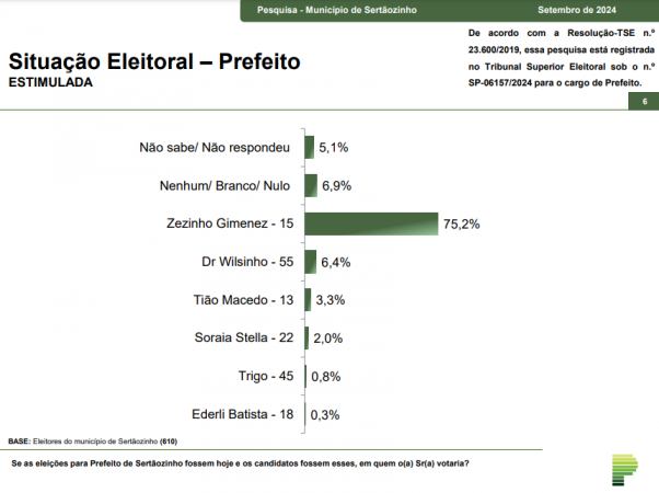 O Instituto Paraná Pesquisas divulgou nesta terça-feira (17), sua pesquisa de intenções de voto para a prefeitura de Sertãozinho. Em primeiro lugar no cenário estimulado, ou seja, onde os candidatos são apresentados ao eleitor, está Zezinho Gimenez (MDB) com 75,2%. Já em seguida, está Dr Wilsinho (PSD), com uma grande desvantagem, totalizando apenas 6,4%. Em terceiro e quarto lugar, está Tião Macedo (PT) e Soraia Stella (PL) com 3,3% e 2,0%, respectivamente. O candidato Trigo (PSDB) alcançou 0,8%, enquanto o último colocado no ranking, Ederli Batista (Rede Sustentabilidade) está com apenas 0,3%. Apesar de estar na segunda colocação nas intenções de voto, Dr Wilsinho (PSD) lidera os índices de rejeição com 39,5%. Em seguida, temos Tião Macedo (PT), Soraia Stella (PL) e Ederli Batista (Rede Sustentabilidade), com 25,7%, 22,3% e 14,4%. Nas últimas colocações estão Trigo (PSDB) e Zezinho Gimenez (MDB) com 12,6% e 6,2%, respectivamente.