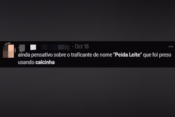 Rhuan Cannygia Chenneman Batista, conhecido como Peida Leite, foi preso em Vila Velha (ES), nesta quarta-feira (16/10). Ligado à alta hierarquia do Primeiro Comando de Vitória (PCV) no estado, sua detenção foi comentada nas redes sociais por conta do apelido inusitado do traficante.