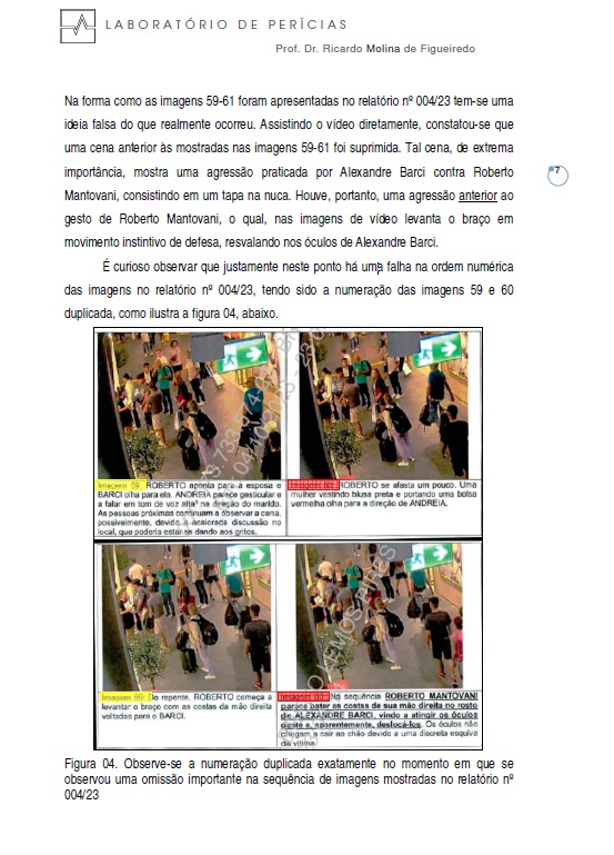 “A pedido deste perito relator, a cena foi repetida por pelo menos três vezes, inclusive em câmera lenta, para demonstrar que Alexandre Barci agride Roberto Mantovani com um tapa na nuca e, só depois de agredido, Roberto Mantovani, instintivamente levanta a mão para se proteger e afastar seu agressor resvalando nos óculos de Alexandre Barci”, escreveu Molina no laudo.