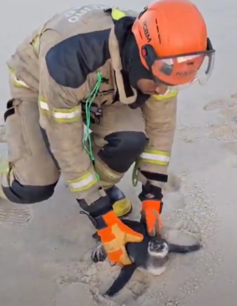 Um pinguim foi resgatado pelo Corpo de Bombeiros na manhã desta segunda-feira (14), após ser encontrado na Praia de São Conrado, na Zona Sul do Rio.