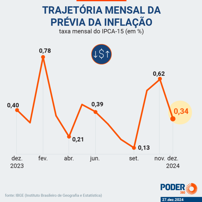 Conhecida como a prévia da inflação, a taxa anual do IPCA-15 (Índice Nacional de Preços ao Consumidor Amplo 15) foi de 4,71% em 2024. Apesar de ter sido inferior à registrada em 2023 (4,72%), ficou acima do centro da meta, de 3%, e do teto, de 4,5%. Os dados foram divulgados pelo IBGE (Instituto Brasileiro de Geografia e Estatística) nesta 6ª feira (27.dez.2024).