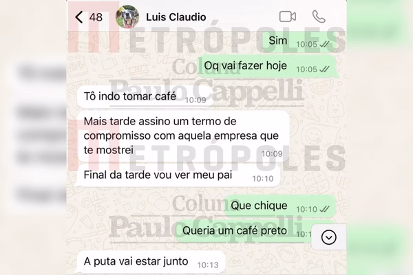 Na manhã de 15 de setembro de 2023, às 10h05, Natália perguntou: “O que vai executar hoje?”. Luís Cláudio respondeu quatro minutos após: “Tô indo beber cafezeiro. Mais tarde assino uno fim de compromisso com aquela empresa que te mostrei. Final da tarde vou testemunhar meu instituidor”.