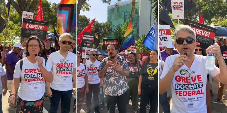 Professores e técnicos-administrativos realizaram, nesta quarta-feira (15), um protesto em frente ao ‘Ministério da Gestão e Inovação’, na Esplanada dos Ministérios. Enquanto se manifestavam do lado de fora do prédio, representantes do Sindicato Nacional dos Servidores Federais da Educação Básica, Profissional e Tecnológica (Sinasefe) participaram da 5ª rodada de negociação da Mesa Específica e Temporária, que debate a Carreira Docente.