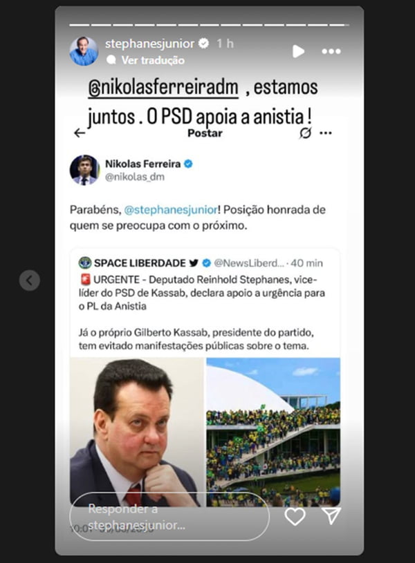 A declaração de apoio de Stephanes foi celebrada por bolsonaristas como o deputado federal Nikolas Ferreira (PL-MG) e o líder do PL na Câmara, Sóstenes Cavalcante (RJ).