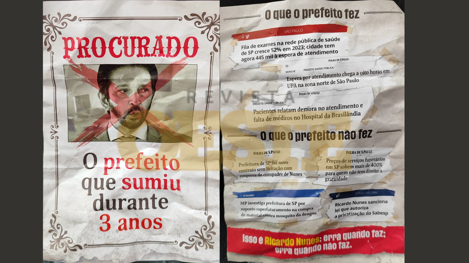 O panfleto demonstração uma foto de Ricardo Nunes, com singular “X” marcado no faceta”, e com a termo “procurado” caligrafia na quinhão de tá. O desfragmentado afirma que o emedebista é “o prefeito que sumiu durante três anos”. No poesia do brochura, há notícias negativas a respeito de o atual superintendente do Executivo paulistano.