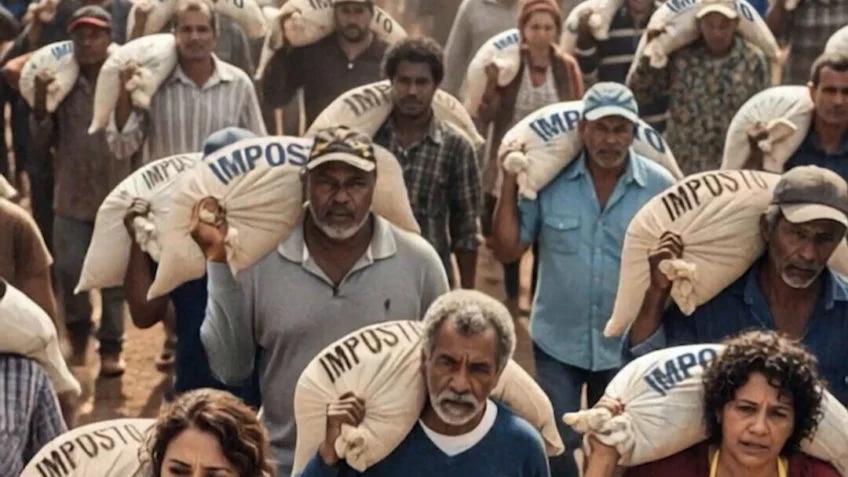 A propaganda critica a carga tributária sobre os mais pobres e defende a taxação de “bilionários, bancos e sites de apostas”. Mostra trabalhadores abatidos carregando grandes sacos com a inscrição “imposto”, enquanto os ricos aparecem como homens brancos de terno, segurando sacos pequenos com o mesmo rótulo.